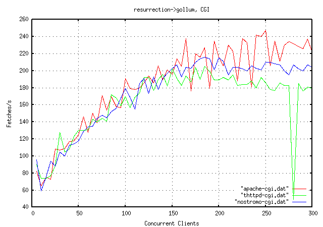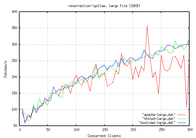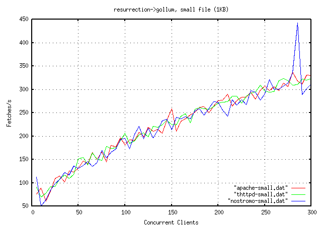 We did the measurement for three different scenarios; small files of 1KB, larger files of 16KB, and a small CGI. The measurement always started with 5 concurrent clients and increased for 5 clients every 15 seconds until the maximum of 300 concurrent clients was reached. To be sure that the sent data was right, we turned on checksum verification in http_load.